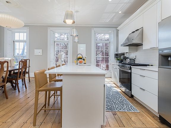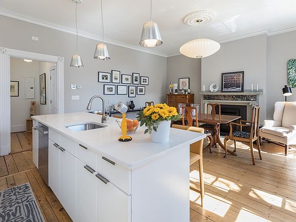 Historic Harvard Street Penthouse with three bedrooms and two bathrooms, located near John Harvard Mall, TD Garden, North End, & Downtown offers 1830 sf of living space. High ceilings and oversized windows grace the great room and chef’s kitchen equipped with white shaker cabinetry, quartz countertops, stainless appliances, & island seating. The elegant dining space features a marble mantel with a gas fireplace. The living room with a marble mantel has a gas fireplace, a spacious bedroom/office w/double closets,a third bedroom and full bath with a tub are on the third level. The atelier primary bedroom with cathedral ceilings and a deck off French doors overlook The Harvard Mall. This suite includes custom walk-in closet, a marble bathroom with oversized glass shower, and a laundry center. Boston skyline and Bunker Hill Monument views from the private roofdeck are expansive. This elegant home has a separate entry with access to basement storage, AC, rental parking.