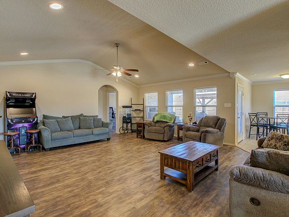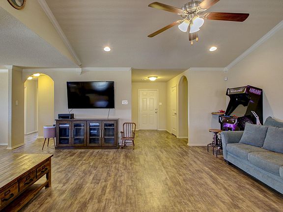 Welcome to this charming 3-bedroom, 2-bathroom home situated on a corner lot with an inviting open floor plan, perfect for comfortable living and entertaining. The spacious living room boasts vaulted ceilings, enhancing the sense of openness, while crown molding throughout adds a touch of elegance. The chef’s kitchen features granite countertops, modern cabinet pulls, closet pantry and an island that provides additional workspace. The convenience of both an eat-in dining area and a formal dining space allows for flexible dining options. This home offers a thoughtfully designed split floor plan, ensuring privacy and tranquility. The primary bedroom is a retreat in itself, showcasing a tray ceiling and providing access to an ensuite bathroom with a double sink vanity, a relaxing soaking tub, and a separate shower. The primary bedroom also features a walk-in closet that conveniently connects to the laundry room. Step outside to the updated exterior patio, perfect for enjoying the outdoors. The spacious backyard is complemented by a charming pergola, creating an ideal space for outdoor gatherings. The fully fenced yard provides both privacy and security.