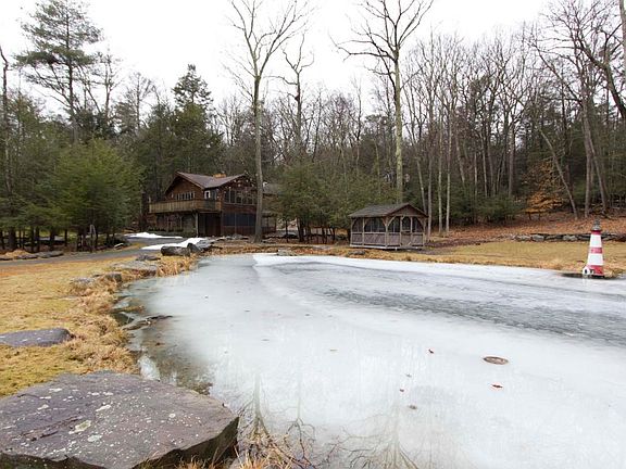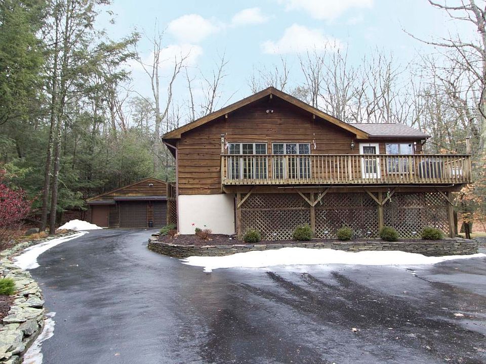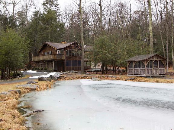 Lake Wallenpaupack Home with Boatslip & Pond! Home offers 3 bedrooms plus office, 3 full baths, open floor plan with stone fireplace in living room, bright & airy sunroom, spacious family room with fireplace and wet bar, tons of storage & more! Large deck, screened patio with hot tub, detached 2+ car garage with large work room and golf cart door, paved driveway and more! Situated on 1.45 acres with pond, gazebo & adorable bridge! A well built home that has been loved & impeccably maintained!