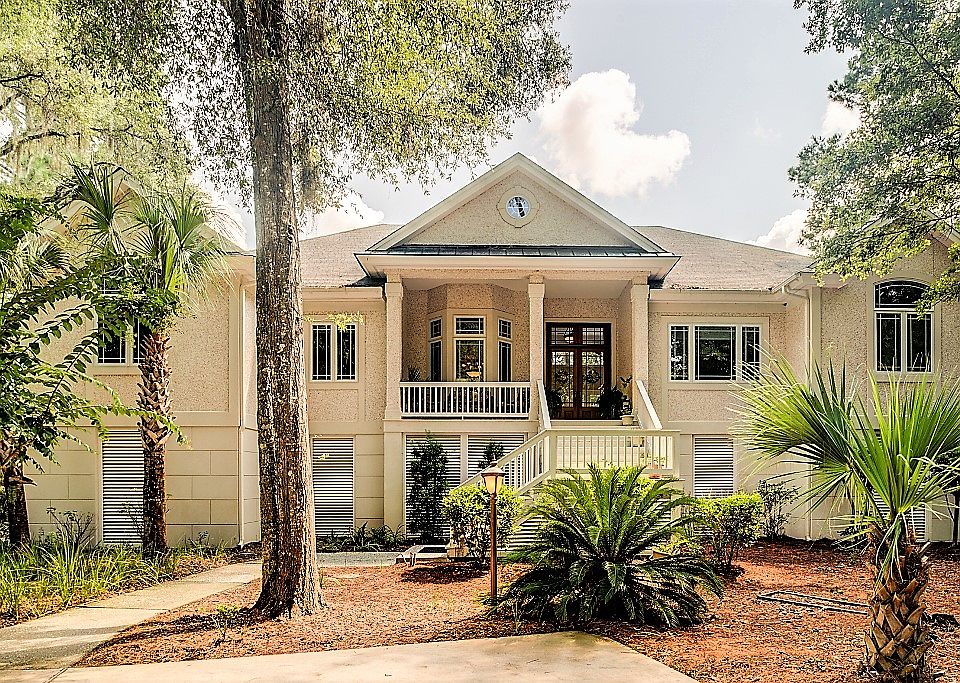This architecturally unique tabby home offers fantastic sunrise views of Callawassie Creek from all living areas, in located in a residential nature preserve & sits on 1.5 lots. The foyer opens to living & dining rooms with a full wall of windows & 13.5' high ceilings to create a bright, & spacious feel throughout. Oak floors, tray ceilings, are featured along with a renovated Kit w/high-end appliances, and Corian counters tops. Fantastic master suite and spa like bath-great outdoor entertaining on deck. Quality throughout. 7.1 Dolby sound system along with many, many Extras!
