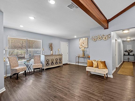 This beautifully updated home offers an open layout with 4 bedrooms, 2.5 baths, and a bonus room on a quiet cul-de-sac backing up to green space. The great room features vaulted, beam-accented ceilings and a cozy fireplace, while the kitchen includes quartz countertops, all-new appliances (2023), and a spacious bar that opens to the main living areas. Updated bathrooms throughout add a fresh, modern feel. The primary suite offers vaulted ceilings, backyard access, and a spa-like bathroom with a soaking tub, double vanity, oversized walk-in shower, and generous closet space. A deep two-car garage with a workshop and sink provides excellent storage. Outside, enjoy the landscaping, zoysia sod, and an entertainer’s backyard complete with a large patio, gazebo, and in-ground pool with a new liner (2023), diving board, and slide. A perfect blend of comfort, style, and outdoor living.