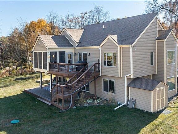 Tucked at the end of a long private drive sits this immaculately kept and beautifully updated 4 bed, 4 bath contemporary ranch perched above the 3rd and 4th holes of Eagle Ridge East Golf Course in the heart of The Galena Territory that offers the perfect fusion of luxury, elegance, natural beauty, and a gorgeous setting with seasonal, treed views looking over the golf course and into the lush scenery beyond. Airy main level houses dramatic great room style living area with an abundance of natural light at every turn that features soaring cathedral ceilings, rich wood flooring, multiple skylights above, warm and inviting gas fireplace with ornate wood mantel, open dining area with ample room to entertain and direct access to three seasons room with incredible rear-facing views, modern kitchen with stainless appliances, stunning granite counters, sleek black cabinetry, stylish tile backsplash, eat-at breakfast bar and access to large rear deck overlooking the pristine landscape that surrounds, comfortable guest bedroom with nearby full bath that has spectacular tile surround shower, and spacious primary bedroom that is a personal oasis, with more cathedral ceilings, breathtaking rear views and adjoining spa-like private bath with granite-topped vanity and huge tiled shower with glass doors, integrated opaque window and seating area. Retreat to the finished walkout lower level to find a generous family room with access to large lower deck that spans the length of the house, a large secondary guest suite thar rivals the primary with lavish private bath that has granite topped dual vanity, tile floors and another oversized tile shower with massive glass doors and integrated opaque window, a fourth bedroom with shared access to an additional nicely appointed full bathroom, sizeable laundry room with plenty room to work, and expansive unfinished storage area. Enjoy the outdoors and amazing setting from the main level deck that adjoins three seasons room, both offering long treed views and perfect vantage points to take in the idyllic setting, or the sweeping lower deck that feeds to the amazing, manicured yard with landscaped highlights that surround the home. Additional amenities include asphalt drive with ample parking, garden shed for storage, home converted to natural gas, most all windows are newer. Central location with easy access to all amenities of The Galena Territory, including Owners' Club minutes away that features indoor pool, outdoor pool, fitness facility, game room, multi-sport gym, tennis courts and more, tranquil Lake Galena, and miles of gorgeous paved and unpaved trails. Just minutes from Eagle Ridge Resort & Spa 63 holes of golf, multiple restaurants, The Country Store, and the newly renovated Stonedrift Spa. With its premier location, incredible golf setting, and high-end finishes, this home is a rare gem that combines modern living with rustic beauty in one exceptional package!
