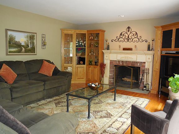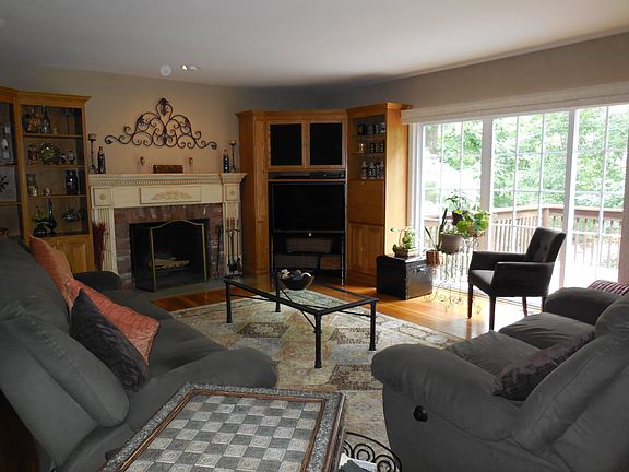 Stunning home - gorgeous setting. Custom kitchen with 42" high cabinets, skylight and granite counter tops. The thoughtfully designed cabinetry is perfect for those who love to cook. Living room has vaulted ceiling and is open to the dining room with crown molding and custom window treatments. Both of them have French doors. The family room has a fireplace and slider to the deck. It's open to the kitchen. The double wing staircase leads to the upper level 3 bedrooms and den/office. Master bedroom has walk in closet and full bath with soaking tub - ideal for relaxing. Finished playroom with workroom area walks out to inviting patio, fire pit and basketball area. Beautifully landscaped. Everything about this house is special.