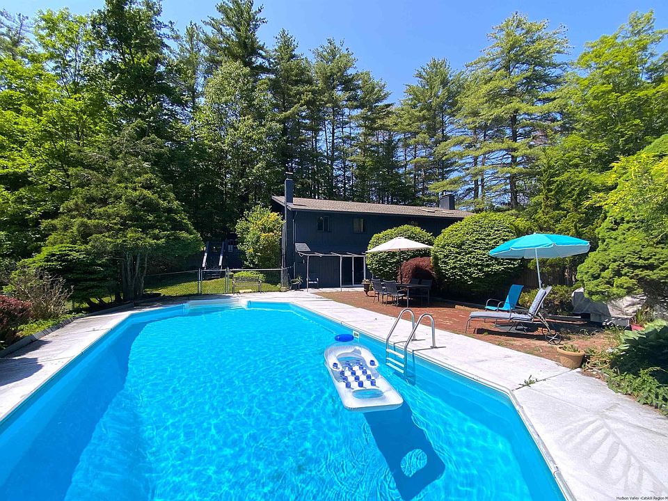 THE BEST OF ALL POSSIBLE WORLDS! This early 1970’s four bedroom home was built to easily accommodate a number of people, yet it offers plenty of privacy with separation of living and bedroom spaces, three full bathrooms, a den, plus a swank finished basement with wood stove, built-in bar and a rumpus room. Working from home here is a breeze -- it even has two home offices, one of which could be converted to a studio apartment with its own separate entrance. The warm weather calls you outdoors to your own secluded garden and in-ground heated swimming pool, large patio and two decks; one deck off of the primary bedroom suite, complete with a hot tub! With tons of space, both indoors and out, for entertaining, and an exceptionally well designed kitchen and open floor plan, you’ll enjoy everything from large gatherings to peaceful days at home in this well-proportioned and appointed contemporary. Conveniently located on nearly one and half acres in a quiet neighborhood looking back out onto the woods, just minutes from Woodstock (but with Hurley taxes) and 10 minutes from the NYS Thruway and Kingston, this lovely home is perfectly situated for both full time and part time enjoyment!