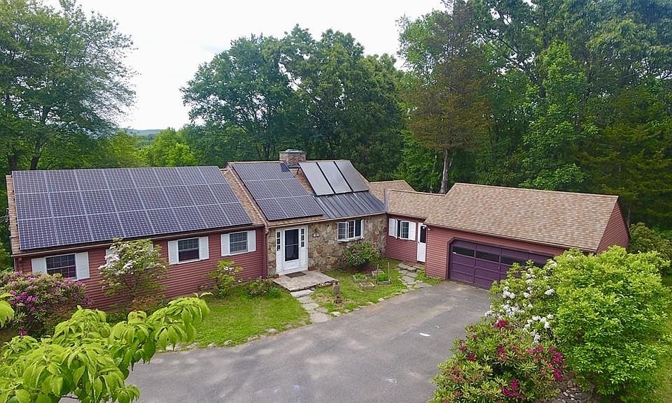 This light and bright executive ranch will surely impress! South facing on almost an acre for optimal solar use!! Enjoy this energy efficient 4 bedroom, 3 bath home with many special features. The cozy living room with stone fireplace enjoys seasonal views to the north. The open floor plan kitchen/dining, great for entertaining, opens to the expansive rear wrap around deck! The master bedroom with full bath and walk in closet, another bedroom and full bath complete the main level. The lower level with newer laminate flooring and lighting has additional square footage including a large family room with fire place, two bedrooms, full bath and separate laundry room. This level also walks out to the rear yard. Nearby hiking trails, close to the Five College area, minutes to UMass, Mt Holyoke or shops and restaurants or Springfield's new attractions! A lovely home with energy efficient solar panels, ask about benefits! Private but close to everything!