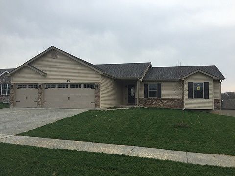 Actual address is 438 Prairie Creek Dr, Foristell MO 63348.Prairie Creek street is NEW as has not shown up on Zillow yet.Enjoy all the Wentzville Amenities with only Foristell zip code.3 CAR GARAGE! WALKOUT LOWER LEVEL!! Gorgeous 3 Bed, 2 Bath Ranch home offers entry foyer, VAULTED Great Room, Kitchen and Master Bedroom! Kitchen boasts breakfast bar, Maple, soft close cabinets and drawers with hardware, GRANITE counter tops, recessed lighting, ALL STAINLESS STEEL APPLIANCES INCLUDING REFRIGERATOR. Great Room fits the whole family! Master Suite shows off vaulted ceiling, ceiling fans in all bedrooms, walk in closet, Master Bath includes 5 foot shower with glass doors as well as gentleman height, double bowl vanity. Main Floor Laundry. TV/Phone wired in bedrooms and great room, R-38 ceiling insulation, architectural shingles, ice maker hook up, rough in bathroom plumbing!Hardwood in the foyer and Cermaic tiles in the kitchen, dining room and bathrooms All lights and fixtures are oil bronze,2' faux blinds on all windows.10x10 patio and a huge DECK 16x12 will be installed in late spring along with fully sodded lot. Available April 31st 2015.Please call show contact info for private showing