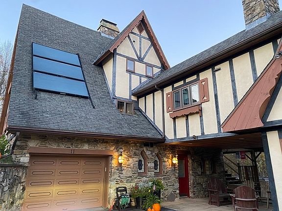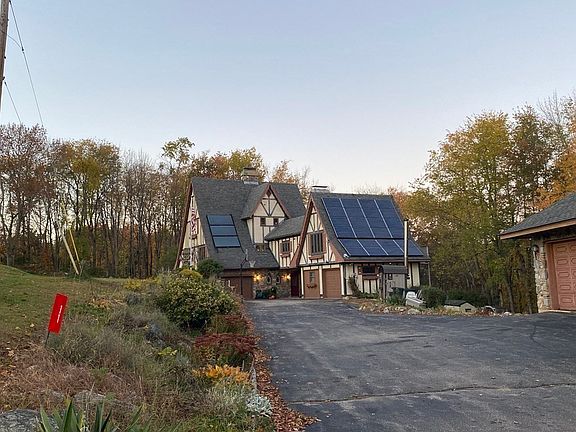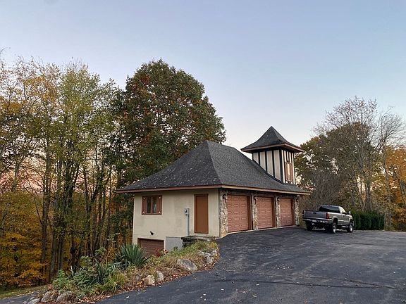 Buyers got cold feet-their loss is your gain. Custom built stuccoed chalet home w/3 Bedrooms, 3 baths, 5 fireplaces, incredible stonework, stain glass windows & 4+ car garage on over an acre of land. Homeowners have lovingly updated & improved the home throughout-updated windows, doors, flooring, baths, kitchen, solar panels for hot water & electricity & outdoor wood boiler for heat as an additional source of heat (also oil). Over sized bonus room w/wet bar, 3/4 bath w/sauna, laundry room & 1 garage space. Large living room, eat in kitchen w/fireplace, dining area, two bedrooms w/cedar closets, bathroom & family room w/fireplace. Top floor has an office area, master bedroom w/bath, fireplac& balcony. Covered patio w/fireplace & recessed lights, Oversized two story deck (built to hold a hot tub) overlooks a private yard w/above ground pool. 2 car garage has been converted to an exercise room & 1 garage bay. Add'L building has 2 garage spaces, w/storage space, workshop & bonus room