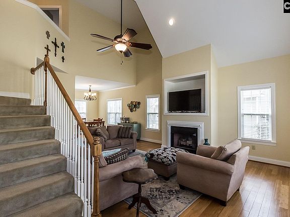 - Living Room: Fireplace, Floors-Hardwood, Ceilings-Cathedral, Molding, Ceilings-High (over 9 Ft), Ceiling Fan