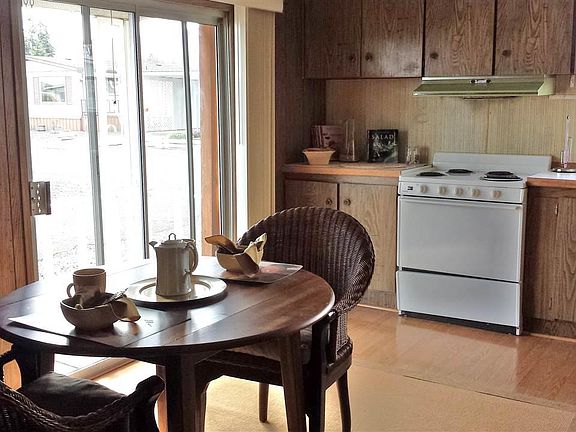 Affordable home in Juniper Mobile Estates. Home offers 2 bedrooms, 1 bath, sunny kitchen with eating area. Living room with wood stove. Bedroom one is spacious with walk-in closet, bedroom 2 for guest room or office. Large covered front deck with view of mountains. Carport and shed for garden supplies or workshop. Partially fenced back yard and easy care yardscape. In-town close to grocery, restaurants and banking.