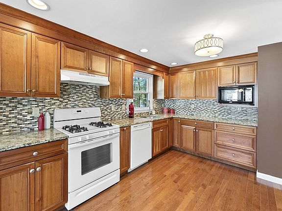 Lovely Split Level/Raised Ranch style home that's located in the beautiful Pioneer Valley that's close to the neighborhood park, biking trails and center of town. Boasting renovated kitchen & bathrooms/some new Pella Windows/New Hardwood Floors in many rooms/HotWT-2022 & More! You'll love the updated Kitchen w/new handsome top-of-the line Kraft-Maid cabinets/granite counters/tiled backsplash & gorgeous hardwood floors flow into a cheerful dining rm w/slider to the back deck that views the private yard. All open to a bright & comfortable living rm w/vaulted ceiling & cozy fireplace to enjoy. Three generous bedrooms all w/newer stylish laminate floors w/lots of closets along with a remodeled tiled bathroom w/dual marble sink vanity! Lower level is great for entertaining offers a spacious family room with brand new plush carpeting, a sparkling bathroom w/large walk-in tiled shower & marble vanity, a spacious storage rm w/new carpeting, laundry rm & walk out 2 car garage!