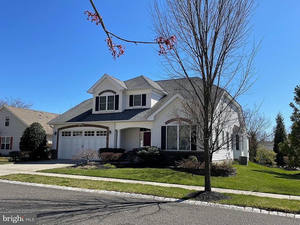 Welcome to the sought-after active adult community of Wyngate at Medford. We proudly present this beautiful expanded Castell model – one of the community’s more spacious homes, boasting 3168 square feet of elegant living accommodation with many upgraded features. The front entrance opens to the most impressive foyer. Please note the gorgeous hardwood floors, octagonal tray ceiling with custom recessed lighting, the gleaming white custom trim - 7” baseboards, wainscoting and shadow boxing. French doors open into a study to your right, and a turned staircase leads to the second level on the left. All windows have white plantation blinds and there is recessed lighting throughout the home. A private hall leads to a guest ensuite bedroom. Beyond lies the dining room, open to the foyer and boasting the same custom trim and tray ceiling. The dining room offers a lovely bay window and fine chandelier and is separated from the expansive great room by a knee wall . Bathed in natural light and featuring a vaulted ceiling, gas fireplace, with white mantel, dentil molding and marble heart, this expansive, versatile space has a ceiling fan and light, the latter complementing recessed lighting. The gourmet kitchen offers tall cream Wood-Mode Brookhaven cabinetry, granite countertops, and stainless steel appliances - including a Bosch 5 burner gas range, with Zephyr hood, a Bosch wall oven, with built-in microwave and a double door, two drawer Samsung refrigerator. Two pendant lights hang over the kitchen island, which houses the stainless double sink, Bosch dishwasher and convenient breakfast bar - ensuring ample space for casual dining. The breakfast area adjacent to the kitchen has access to the rear patio and opens to the sunroom, which features walls of windows and provides a light and bright bonus space for relaxation. Returning to the foyer, a hallway leads to a master bedroom, with cream carpeting, white trim work and a tray ceiling. There are two closets and the master bath boasts a fine glass doored shower with marble bench, a double cherry vanity and white commode. The laundry room can be found off the hallway, and has access to the attached two-car garage. A second refrigerator can be found in the garage – ideal during the holidays or when entertaining. The turned staircase takes us to the second level, where you will find a loft area, an extremely spacious third bedroom with recessed lighting, ceiling fan and Jack and Jill full bath. An unfinished storage room houses the homes mechanical systems, including a tankless hot water heater, alarm panel etc. Wyngate’s clubhouse offers countless activities including pickle ball, tennis, bocce, an outdoor pool, walking trails, a fitness center, craft rooms, abundant social activities and bar area. The Association takes care of lawn maintenance and snow removal providing you and your neighbors with carefree living. The community lies moments away from Johnson's Farm and all their seasonal activities and fresh produce and is a convenient drive to local shopping areas like The Promenade and Medford Village. If you have been waiting for a home to become available in Wyngate at Medford - here it is! 11 Keswick Path deserves your serious consideration.