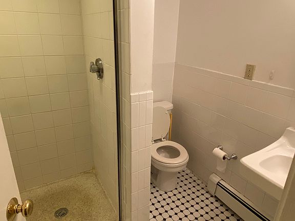 Shared bathroom, rear facing, garden level, white painted brick wall.