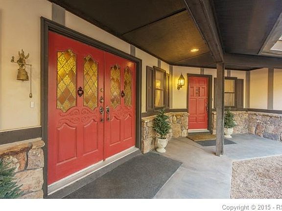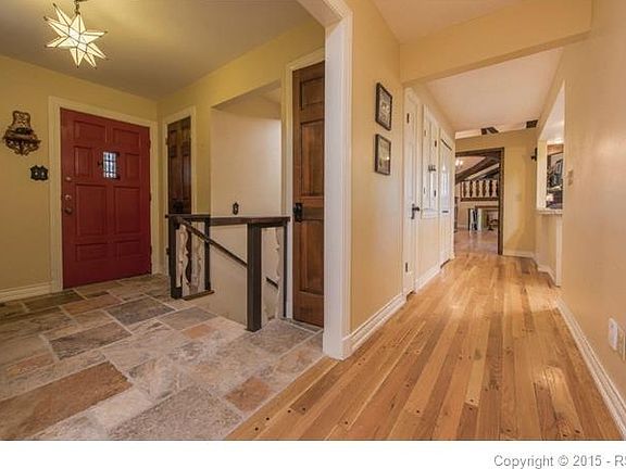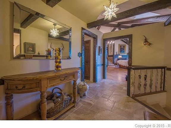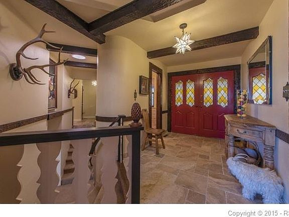 All Main level living! A total restoration with European warmth, this historical property was once titled to "Her Majesty the Queen", owned by the Canadian Government for their generals stationed at Norad. Old world charm abounds with beamed ceilings, travertine & wide plank hickory wood floors. Double entries to a mud room or enter to inviting great room with massive fireplace, beamed ceilings. Large dining area that opens to updated kitchen w commercial grade appliances, several pantry closets & lg granite breakfast bar.