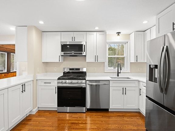 Beautiful newly renovated charming home nestled in a highly desirable neighborhood. This 3-4 bedroom Cape style home is updated to todays style, yet has character! The 1st FL features gleaming hardwood floors throughout, White shaker Quartz kitchen with high end appliances, Full updated bath, Large family room with shiplap wall feature open to kitchen area, side room could be used as office or dining room, Bonus Sunroom is perfect for hot summer days coming in from the in-ground pool. Upstairs you'll find 3 bedrooms, new carpet, updated bath, Master that is very spacious w walk in closet, master bathroom and an amazing Juliet covered balcony overlooking the property. The finished basement is an open and cozy room with 2 closets-was prev used as a 4th bedroom (town assessor lists as 4 BR) There's more! Experience the convenience with the oversized garage-a haven for both vehicles and hobbies! Come create your private oasis in the backyard surrounding your tranquil in-ground pool!
