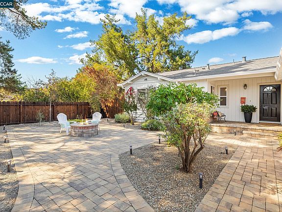 Tucked on a quiet court in Pleasant Hill, this remodeled single-story home combines modern updates with inviting indoor-outdoor living. Inside, the spacious living & dining combo centers on a brick fireplace with built-ins and direct access to the yard. The updated kitchen features granite counters, a gas range, pantry storage, and bar seating that opens to a welcoming breakfast nook, ideal for everyday meals. A wall of custom cabinetry with glass-front uppers and wine storage adds both elegance and utility. Three bedrooms provide comfortable retreats, each with hardwood floors. The primary suite features a private bath with dual sinks and a stall shower, while the hall bath also offers a walk-in shower and ample vanity space. Outdoors, enjoy a variety of spaces for relaxation and entertaining. A private front courtyard with paver hardscape and built-in firepit sets the tone for gatherings. The backyard extends the lifestyle with a covered patio, pergola seating area, and a custom putting green surrounded by mature landscaping. Set on a corner lot with a paver driveway, this home blends privacy and convenience. Its location offers easy access to neighborhood parks, top-rated Pleasant Hill schools, BART, and major commuter routes.