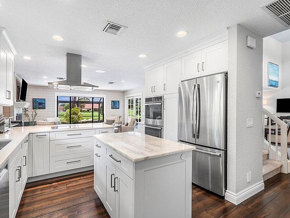 Fantastic location on the Par 3 of the 13th Green of the Fazio golf course behind a beautiful lake & fountain. This 3/2.5 home plus sitting room in Master suite, has been completely remodeled with custom finishes in Kitchen, master bath, guest bathrooms, solid core doors throughout the home and has a new 2017 roof. Beautiful wood floors, wood burning fireplace and electric silhouettes in the family room. Dual HVAC systems 2015 & 2016 and serviced 2 X's a year. Pool resurfaced with new Diamond Brite & LED lighting 2018, All new gutters outside, new landscape lighting front and back, whole house hurricane protected w/ impact glass, Accordion Shutters, and panels. Garage has hurricane door. Sought after southern exposure with incredible, amazing sunsets over the lake and golf course