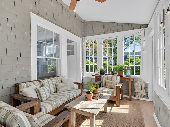 Bright window-lined sunroomClassic detailsSitting areaThoughtful layoutModern comfortsCraftsman cabinetryExposed timbers