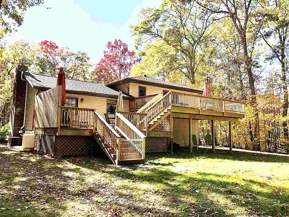 Beautifully renovated with great attention to detail, this multi level home sits on a quiet dead end road backing up to over 60 acres of protected land owned by the Tonche Association. Enter the front door into a large open space with a stunning gourmet kitchen with custom made cherry cabinets, quartz countertops, a breakfast island, stainless appliances and gleaming wood floors. The cozy brick fireplace (with propane insert) can be enjoyed throughout this space and an amazing amount of sunlight makes this a dream. The dining room leads to an extensive multi level deck overlooking the private back yard. Perfect for entertaining, you will want to live here all summer long. This is outdoor living at its best. Upstairs are 3 bright and comfortable bedrooms and a newly renovated bathroom. The upper deck is off the main bedroom and offers a relaxing and peaceful space. Downstairs is a spacious area ideal for quiet evenings, gatherings for friends and family, studio space and much more. The door leads to a patio with direct access to the back yard. The full basement offers additional space for a workshop.