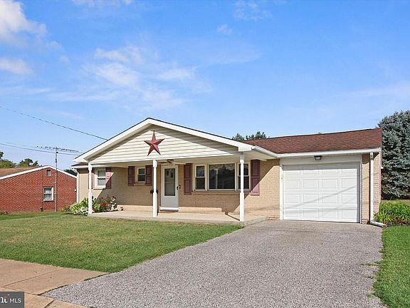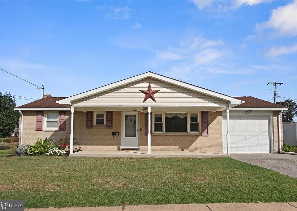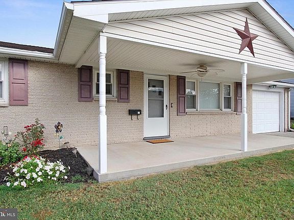 Enjoy one floor living in this sweet little rancher in Dover! Enjoy relaxing on the large covered front porch with a ceiling fan & a nice perennial garden to the side. There are original hardwood floors in the living room & dining area. 2 Bedrooms with wall-to-wall carpet (w/hardwood flrs beneath). One BR has stackable washer/dryer installed in closet. (could easily be removed if buyers wants to use the W/D in the basement). Updated full bath with beautiful gray & white ceramic tile walls & shower surround. Large walk-in shower. Kitchen with gas stove & refrigerator, Stained wood cabinets & ceramic tile back splash. Sliding glass doors in Dining area leading out to small cement patio that overlooks the level backyard with large pine trees to rear. 1 Car attached garage with electric opener. Full unfinished basement offers additional square footage for potential future living space. Updated Gas furnace, central air, 100 AMP electric panel & gas hot water heater. Take a look today at this well-maintained home!