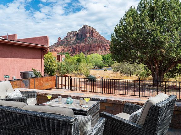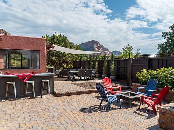Great opportunity to visit Sedona whenever you can and share your home w/other visitors who want comfort and views in between. Centrally located in the Chapel area with multiple exterior sitting areas. 3BR, 2BA, bonus room w/totally remodeled interior, updated for the discerning buyer. High beamed ceilings, clerestory windows to maximize red rock & chapel views, spacious rooms, split floor plan w/barn door on guest wing. Master suite is awesome w/spa-like bath, fabulous views. Appliances, amenities are new and add that touch of home upon arrival. Easy clean wood faux laminate flooring and tile in baths, modern lighting & fans add to the low maintenance of the property. Paver patio includes fire pit, barbeque, bar area w/additional seating & sail for shade. Ready for Zen water feature.