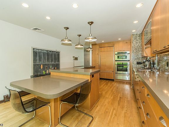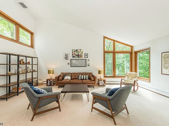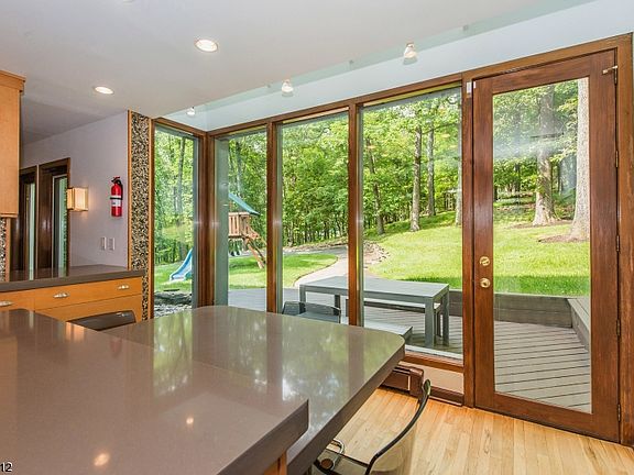 Sun-Filled, Smartly designed Contemporary. Stunning open floor plan with marble fireplace, wet bar, cathedral ceilings, skylights, hardwood & marble floors, over-sized windows and decorative glass. Easy entertaining with the renovated gourmet kitchen. High-end appliances, dumbwaiter & wine refrigerator. All with views overlooking private, wooded backyard. A first floor bedroom w/ private bath for guests. The master suite invites you to relax at the end of the day. Featuring super-sized mirrored, marble master bath, 2 walk-in closets, laundry chute, high ceilings, skylights & balcony. Three additional 2nd floor bedrooms with a renovated bath. Finished room on ground floor with separate entrance for professional and/or recreational use. Located on 1+ acres, end of cul-de-sac, minutes from town.