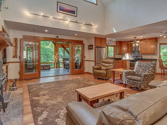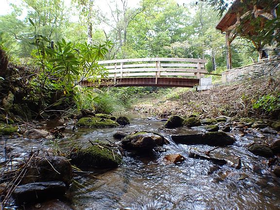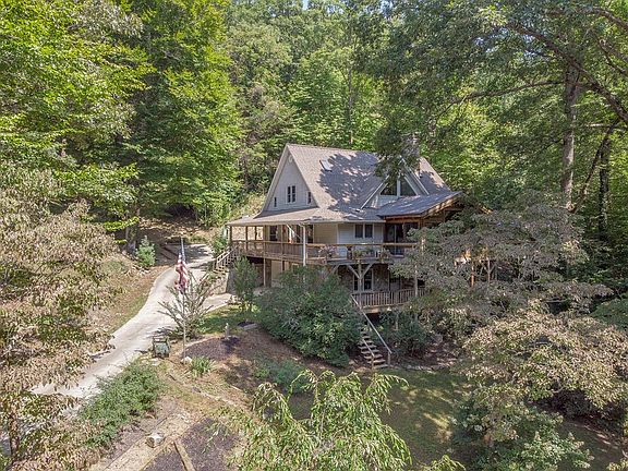 Custom home w/incredible decks & creek!! Enter main door or thru a side door to mud/laundry/pantry. As you enter den/study is to the RT, w/full bath accessed through den or main hallway. Lrg open concept living room, kitchen & dining. Great layout for entertaining. Cherry floors, wood fp, oak cabinets, granite counter-tops, SS appliances & coffee bar. LR opens to gorgeous timber framed sunroom w/tile floors, large picture windows & doors to both side decks. Main level master w/wood burning stone surround fireplace, cedar lined walk-in closet, en-suite bath, dual tall oak vanities w/ granite counter-tops & walk in shower. Sitting room/office/nursery located off the master w/doors to back deck. Upstairs 2 bedrooms w/over-sized closets & full bath: rooms located on either side of the catwalk that overlooks LR. Skylights in both bedrooms allow great natural light. Downstairs family room perfect for game room/movies or place to relax by the wood stove, door to lower terrace, bonus room & full bath. Garage adds workshop space & addt'l storage. Manual transfer switch for a generator. Gazebo down by the creek. Great private location w/state paved road all the way to Betty's Creek GA.