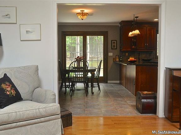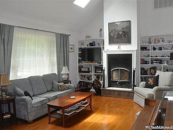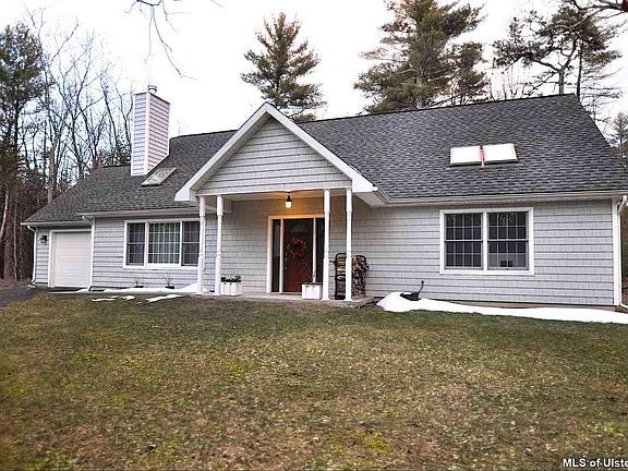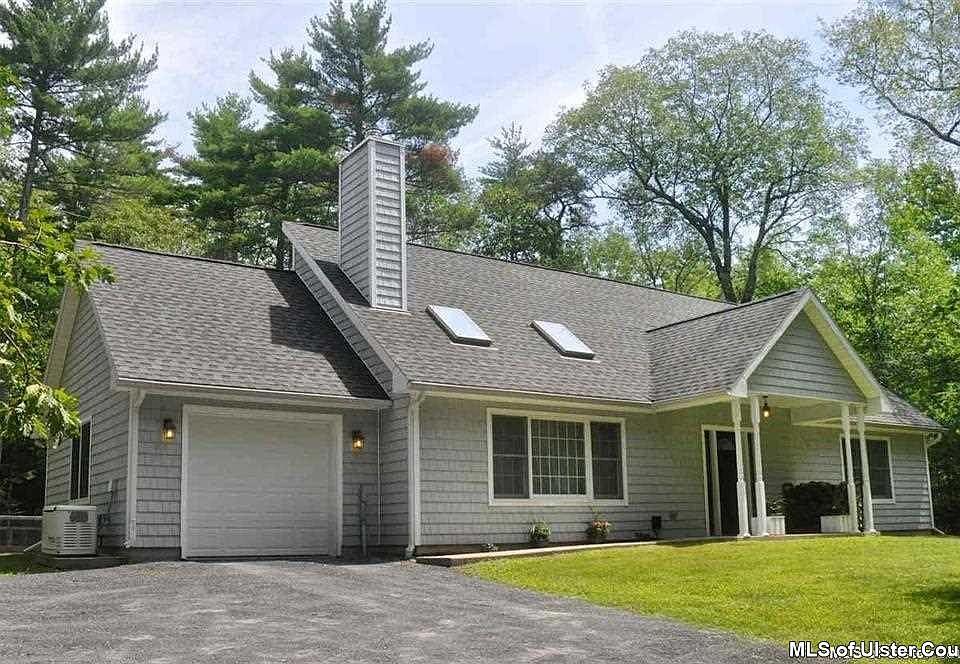 WOODSTOCK WOODS! Privately set on 6 acres this contemporary Cape is perfect for year-round or weekend living. The tiled floor, cathedral entry and dramatic staircase with 2nd story landing, opens to the floor to ceiling living room boasting sky lights and an efficient RSF fireplace. A gracious flow into the dining area with patio doors to the back yard joins the beautiful kitchen with wood cabinets and granite breakfast bar. A separate laundry room is located right off the kitchen and the attached 1-car garage gives you easy access for unloading groceries. The master bedroom with private bath is on the first floor and has a delightful enclosed porch. The second story has a bedroom and full bath. There is an additional unfinished room that had double joists installed during construction to provide a dormer for finishing the space. The 3rd bedroom or Den is off the entry with access to a half bath. Comfort is provided by Central air conditioning, first floor radiant heat and a stand-by, whole house generator. The sunny back yard has a fenced, raised-bed garden ready for your green thumb! Conveniently located to Woodstock & Saugerties Villages, with the local swim club in the immediate neighborhood. This is a MUST SEE! **Seller offering $5,000 at closing toward buyer's closing costs** *Taxes DO NOT reflect any exemptions, Star could bring school tax down* The unfinished room on the 2nd floor could add another 190 sq. ft. of living space and then have 2 bedrooms & a full bath on the 2nd floor with the master suite, den and half bath on first floor.