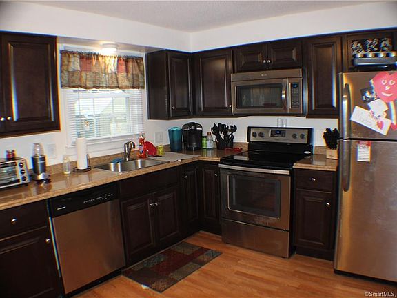Spacious 3 bedroom unit with updated kitchen and bath. New stainless appliances including dishwasher, microwave, oven/range and refrigerator. Newer wood laminate flooring on 1st and 2nd floors, tile floor in bath. Large living room, dining room and bedrooms. Townhouse style unit with bedrooms and bath upstairs. Stackable washer/dryer in kitchen. Newer Thermopane windows and recently insulated. Nice flat yard. Front and private rear entrance, plenty of parking. Quiet convenient location close to schools and shopping. Walk to Lake Pocotopaug.