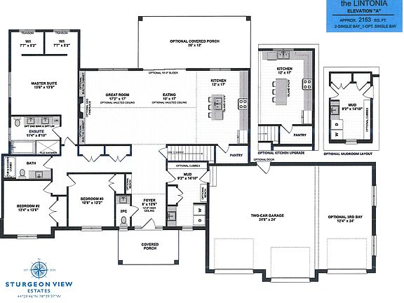 The Lintonia a masterpiece offering 2153 sq.ft. Elevation A, forward facing, double car garage. Exterior options of stone and brick and triple car garage are available as an option. Several Elevations to choose from. Open concept Great Rm. and Dining area featuring gleaming hardwood floors. Kitchen features quartz countertops, with Breakfast Island and walk in pantry. 3Bedrooms, 2-4piece baths, and a Powder Room with a conveniently located mud room, Laundry off of garage entrance. Very private lot located at end of cul de sac lined with trees on one side, and forest view out front of home! Sturgeon View Estates offers a community dock that is 160'tied to the block of land known as 27 Avalon. This block is under POTL, projected monthly fee$66.50. All homes are Freehold and on a municipal road leading through site. We have several Models and lots available, and several Models occupied and enjoying the community of Sturgeon View Estates. Located between Bobcaygeon and Fenelon Falls, enjoy all the Trent Severn has to offer. 5 minutes from Golf and Spa. Book your tour of the site and plan for your dream home. The picture is The Lintonia Elevation B double car side garage. The Model offered is Elevation A, forward facing, double car garage.