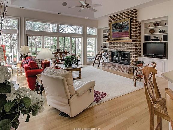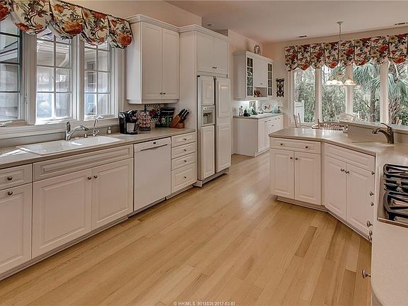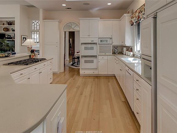 Spacious home offers beautiful water views in the front & views in the back of the 12th hole including the green w/Broad Creek in the back ground. Plenty of windows provides lots of light. Open feeling & good flow from room to room. Large kitchen w/white cabinets, double oven, 5 burner gas cooktop & breakfast area that opens to family room w/gas fireplace. Formal dining room is open to living room (also with a fireplace) providing golf course & lagoon views. This quiet retreat also offers 4 bedrooms, 4 full baths, 1/2 bath (including suite over garage) & Carolina room (with Cypress paneling).