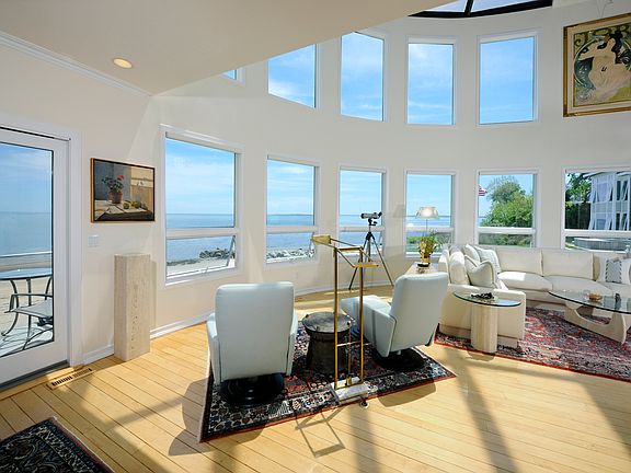 At last... A truly custom designed one-of-a-kind direct waterfront with unusual privacy. Neither contemporary nor traditional, it reflects comfortable, relaxed living...w/a feel-good sense of being at peace w/the sea and its sandy beach. Extraordinary and intriguing high, wide and handsome open interior - enter to extensive views of water everywhere...curved window-walled living rm w/a spectacular glass ceiling. Fossil shell tile floors. Kitchen opens to the dining areas and two-story living rm to synchronize those captivating water views. Soaring 34 ft. stone fireplace, powder rm and a terrace off the dining area. The whole first flr is a powerful expanse of space and light. Upstairs: A very special master bedrm w/its own terrace and large windowed wall to take in all the water views from that msecond-story level. Lovely master bath. Two other sleeping quarters and bath complete the upstairs. Incredible Extra: spacious lower level walk out with an impressive family rm of window walls and another floor to ceiling stone fireplace. Office/bedrm/bath, wine closet, storage and an exercise rm w/glass doors to the ground level terrace abutting the beach. Outside: garden club plantings surround the terrace and grounds, two-car garage w/kit entry and a Belgian block edged circular driveway. Private St. David's Bluff's Assoc w/shared tennis ct and beach. If you are a water buff and love an unusual but easy lifestyle, this home is for you. It could be classified as "Dramatic Simplicity."