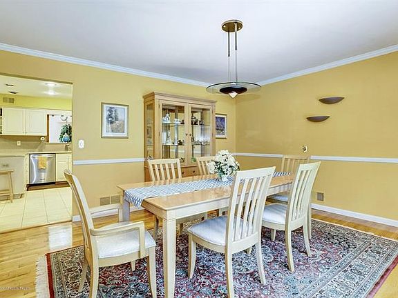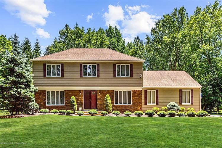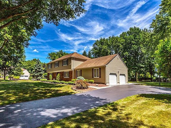 This Classic Center Hall Colonial, Move-In Ready, in the highly sought after Holmdel Village Estates, is set on a magnificent park-like acre with paver walkway, large paver patio and deck. This spacious home with over 3, 400 sq ft, includes: custom designed dramatic sunroom with oversized wall windows, vaulted ceiling; custom kitchen w corian counters and back splash, stainless steel appliances, 4 spacious bedrooms with walk-in and large closets; newer full baths, partial finished basement for extra playroom, oversized 2-car garage, hardwood floors throughout 1st and 2nd floors, crown moldings, newer sidings, furnace, AC unit and hot water heater. Come see this great family home, you will be delighted!