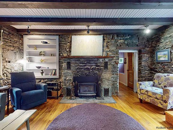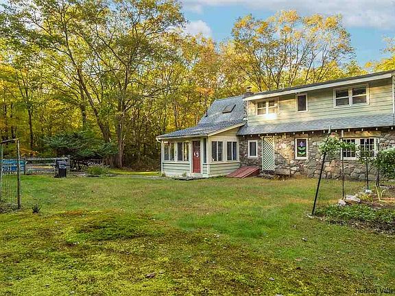 Open House Saturday 11/5 and Sunday 11/6 from 12-3. Tucked away down a Woodstock country lane with only a few neighbors, this home has the charm and character everyone is looking for. Once you step inside the stone walls and wood floors envelop the senses with a nod to the forests and natural bluestone found in the area. Spacious yet super cozy living and dining areas are welcoming for entertaining or quiet movie nights by the fireplace. A main floor bedroom with walk-in closet is at one end and beyond the dining area a large and well equipped kitchen with island awaits. The 3 season sunroom/porch off the kitchen overlooks an in ground pool and gardens in the sizable backyard. Once upstairs, one is greeted by a lovely and generous family room or office space flanked by 2 bedrooms on either side and a shared full bath. The layout of this home is very flexible and offers plenty of work or study from home areas. The location here is EXCELLENT. Private without felling isolated AND convenient to everything. 10 minutes to uptown Kingston and the Thruway, 5 minutes to Woodstock Village or the Ashokan Rail trail. Skiing, hiking, cycling, kayaking and all the wonders of the Catskills nearby as well as farmers' markets, galleries, music and fine dining.