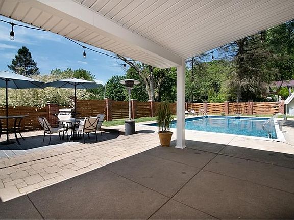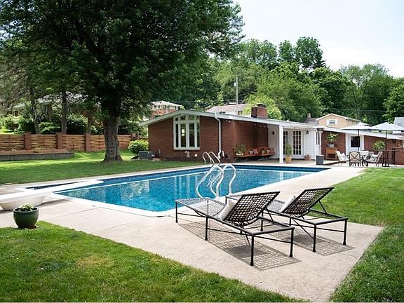 Mid-century Modern meets Malibu in this show-stopping, brick, one-level living masterpiece, complete with a backyard oasis! A cooler home with a flatter, more inviting yard would be hard to find... fenced with brick pillars and basket-weaved wood gives way to a knock out of an entertaining area complete with inground pool, patio, sleek built-in benches, shady spots, shed and a Chick-Chalet! Homesteading just went Hollywood! Inside, this architect-designed home does not disappoint! Open floor plan with soaring ceilings and wood beams. Living room is open to the granite kitchen with big island for gathering. Unique floor to ceiling window showcases the backyard area. The entry hearth room is an awesome coffee/reading spot with French doors. The owners bedroom boasts another unique window and fully updated spa bath. Two additional bedrooms. Take the party downstairs with a finished rustic gameroom with hand notched beams, barn door, kitchenette, updated bath. One in a million!