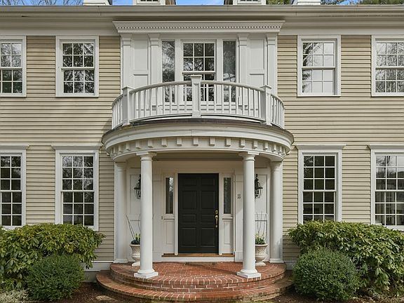 CLASSIC Cambell Smith designed Colonial w/over 5300 SF of living space at the end of a pretty tree-lined cul-de-sac street in the coveted Great Hill neighborhood. This exquisite home boasts exceptional details including custom millwork, high ceilings (over 9 feet!), 3 fireplaces and beautiful oversized windows. The first floor features a renovated, sun-drenched kitchen w/large island, gas fireplace and sunny dining area, a spacious family room with coffered ceilings, FP and french doors, a cozy living room with another fireplace and a gracious dining room, as well as a gorgeous "sun room" with floor to ceiling windows that could an office, playroom or music room. Upstairs there are 5 BR's and 3 full baths including a luxurious primary suite AND a home office. This home has been meticulously maintained and offers beautiful landscaping and lovely bistro brick patio in the back and large side lawn. Great location, walkable to the playground, commuter train and downtown Hingham!