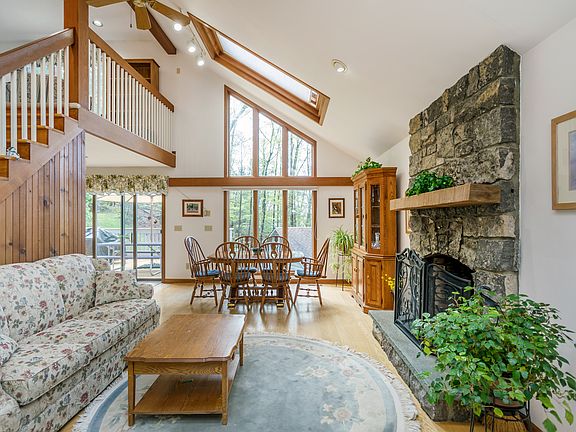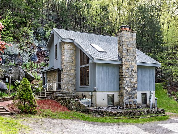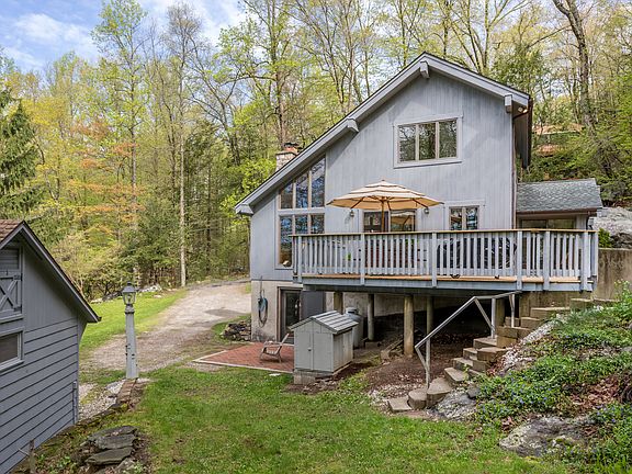 This adorable gem of a home is located in a prime position in CANDLEWOOD LAKE ESTATES in Sherman CT - a private gated lake community amid beautiful natural surroundings that offers residents access to two private beaches on Candlewood Lake and two on Green Pond. This charming, low maintenance Contemporary was built to last - good bones and quality of construction - and features seasonal views of Orchard Beach - one of the community's four private beaches - that is also within walking distance. Nestled into a hillside, the home has a backdrop of dramatic rock outcroppings, while a bright open floor plan greets you upon entering. Large windows and multiple skylights bathe the home in sun and light. The combination living/dining room features a stone fireplace, hardwood flooring and vaulted ceiling, with sliders leading to a newly rebuilt wraparound deck. The main level bedroom also accesses the deck through sliders, while the upper level bedroom has its own sitting room, which can easily convert to a third bedroom, if needed (3 bedroom septic system). The unfinished lower level offers sliders to a rear patio and a half bathroom. Candlewood Lake offers all kinds of water sports, while Green Pond is a spring fed, clear lake that is ideal for swimming and boating in non-motorized craft. A private community dock on Candlewood can be arranged for a modest rental. Newer roof, newly stained white cedar siding. This is an ideal weekend getaway home, or a worry-free year round retreat.