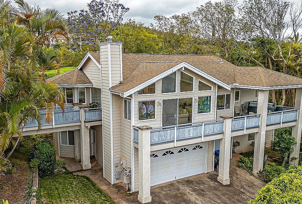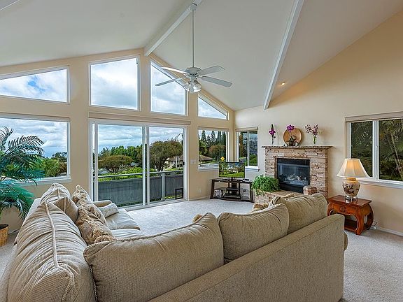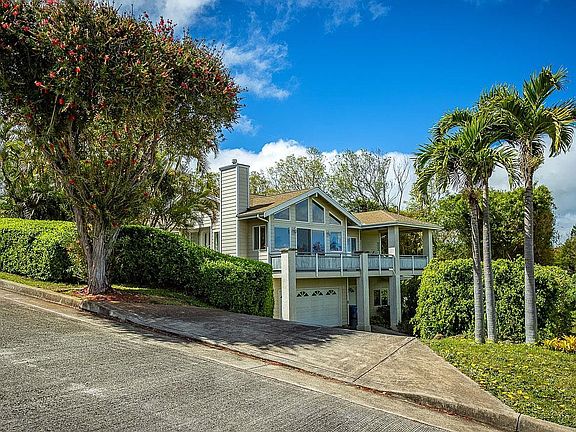 Situated on a magnificently landscaped 18,086 s.f. corner lot in Kula's revered Kulamanu subdivision, this 4 bedroom, 3.5 bathroom, 2,280 s.f., 2-level custom home enjoys lovely West Maui Mountain & coastal ocean views. Passing through the decorative entry trellis there is a rather unique bridge to the front door. The front entrance features 2 vertical leaded glass panels & is bordered on both sides by concave glass-block columns. The main living, kitchen, & dining areas are filled with light as the West-facing great room wall is virtually all glass. There is a custom stone fireplace with a double-edged granite mantel. The kitchen's center island, surrounding counters & backsplash are all rendered in matching granite. The central living area feels uplifting as the cathedral ceilings soar in all directions. The main level primary bedroom, with its vaulted ceilings, spacious walk-in closet, & elegant en-suite bath, enjoys pastoral upcountry views & opens onto the West-facing lanai which features a lovely jacuzzi spa. A large den/mother-in-law guest suite, with separate access, on the lower level has an elaborate wet bar & a dedicated bathroom. There are 2 bedrooms downstairs that share another full bath. All 3 garage spaces have direct access to the house. A large backyard surrounded by lush mature landscaping is extremely private & serene. Kulamanu has all underground utilities & is extremely convenient to many of Maui's finest schools, along with all the amenities of nearby Pukalani & Makawao! Many of Maui's year-round residents & professionals prefer Kula's temperate climate, & the quiet upcountry lifestyle that 9 Paliuli Place offers.