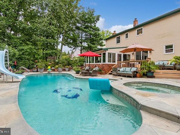 Very spacious, classic brick front featuring 4 bedrooms and 2.5 baths. Enjoy an abundance of closet space, many walk-ins and main bedroom with a walk-thru closet. Large formal living room with French doors and dining room with hardwood floors. Eat in kitchen with stainless Kitchenaid appliances. Step down to your family room with a cozy fireplace and beamed ceiling, then walk out thru sliding door to a gorgeous 19x15 all sunroom with skylights. Ductless heat/air unit makes it comfortable all year long enabling a beautiful, full view of the changing seasons. This backyard is spectacular! Step down from your deck onto stamped concrete and paving stones surrounding an inviting, heated gunite pool with hot tub. Stunning outdoor eating area with gazebo and 8-seat teak dining furniture (extra electricity, lighting and custom fan). Wood storage shed and pool storage shed. Why vacation when you have your own relaxing resort? "Staycation"! This home was made for entertaining! Front yard meticulously maintained with underground sprinkler system (with pressure pump) along with side yard. Anderson windows t/o 3 years ago. 1 year old roof. New front door, custom width and art glass. Generac whole house generator included. Large cul-de-sac lot in desirable Country Club section.