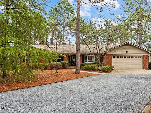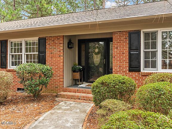 Charming, updated, all brick ranch style home in Whispering Pines is a must see! Situated on a quiet street, located on the 13th Fairway of the Country Club of Whispering Pines Golf Course, this home is sure to check all the boxes! From the moment you walk in the front door, the views of the cozy living room and bright Carolina Room, will have you feeling right at home. The 3 bedroom plus flex room/2.5 bath home has been lovingly and tastefully updated to include flooring, paint, lighting and kitchen/bathroom updates! The spacious primary bedroom boasts a beautiful view of the golf course and mature landscaping with an updated ensuite bathroom equipped with a tiled walk-in shower in addition to the shower/tub combo. The kitchen features beautiful wood cabinets, granite countertops , subway tile backsplash and stainless steel appliances. The outside space has plenty to offer as well! The home sits on over half an acre, has a circle driveway offering plenty of parking, and has a large patio perfect for dining alfresco while enjoying the beautiful scenery.