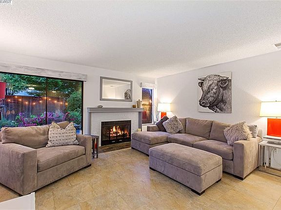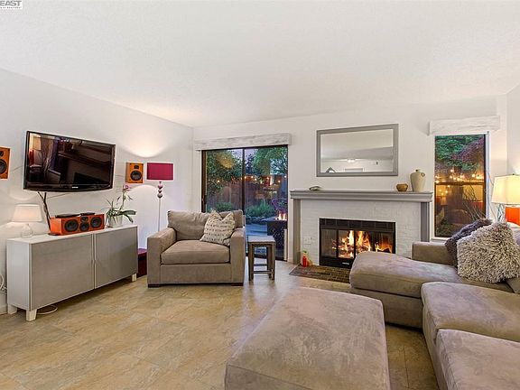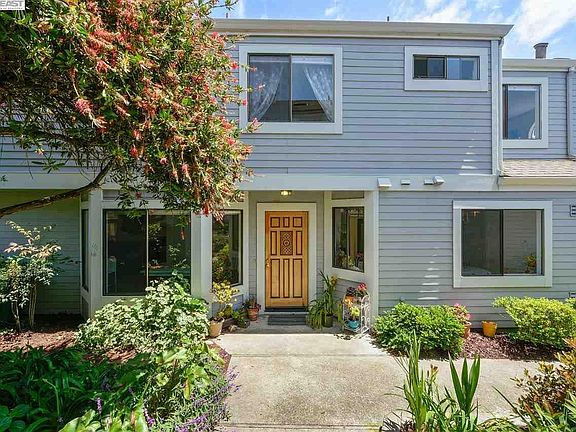 Chic contemporary home in a resort-like location. This spacious three bedroom, two and a half bath home boasts a modern floor plan, lovely natural light and a very special setting. The inviting living room features high ceilings and sliding doors out to your private patio. There is a wood burning fireplace with a classic mantel, and an adjacent dining area with a bay window. Fresh interior paint and upgraded flooring add style, making this space great for entertaining. The sunny kitchen features classic white cabinetry, tile counters and a window over the sink area. The breakfast nook is perfect for morning coffee or casual meals. The luxurious master suite offers a spacious private bathroom with dual sinks and a Roman tub. This private retreat also includes generous closet space and a balcony overlooking the garden. The enclosed backyard offers deck seating and mature plantings. Great location: top schools, lagoon and bay trails & ferry to SF.