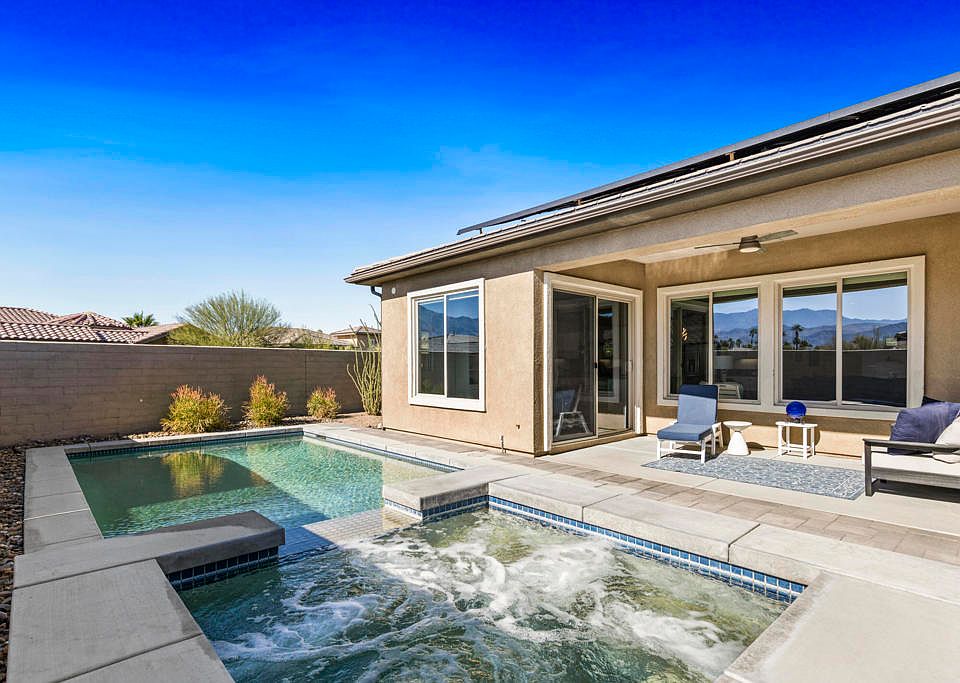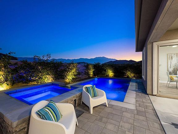 Amazing Opportunity in Del Webb Rancho Mirage!! Situated on a larger and elevated premium corner view lot, this stunning home with a southern and western backyard, has panoramic views of the San Jacinto mountains from almost everywhere inside and out! The living/dining area opens to the backyard entertaining area for the quintessential desert lifestyle! The resort backyard boasts a covered patio, salt water pool and spa, pergola, gas fireplace, fruit trees and breathtaking views of the sunset! The epicurean kitchen includes stainless steel appliances, quartz countertops and a large island for casual dining and entertaining! This plan is a true 3 bedroom with the primary suite separated away from the other two bedrooms! There is an oversized 2.5 car garage, fully paid solar, skylights, LED lighting, frosted glass front door, Hunter Douglas window treatments, an epoxy garage floor and so much more. This home is a very special one! Del Webb Rancho Mirage is a 55+ guarded and gated community that offers amazing amenities, clubhouse activities, pools, spas, fitness center, tennis, pickle ball and more!