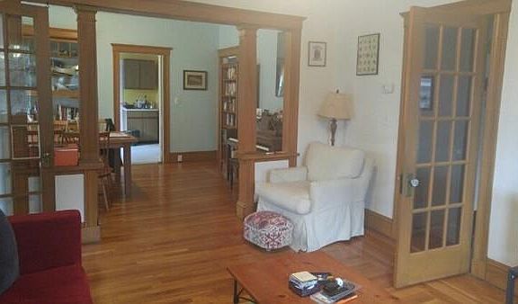 Charming, and convenient eco-friendly 2+ bedroom Newton apartment in two family house for rent. On a tree lined side street with garage parking and a bright, Sunny sunroom. This 2ND floor apartment is 1 minute from the Pike and 10 from downtown. Prefer public transit It's 1 block to the 57 and 501 express buses. Short distance to Oak Square and Newton Corner. Features 2 equal sized bedrooms with good closets, airy living room, dining room with beautifully maintained built-ins, kitchen with new dishwasher separate office. SHORT-TERM AND FURNISHED.