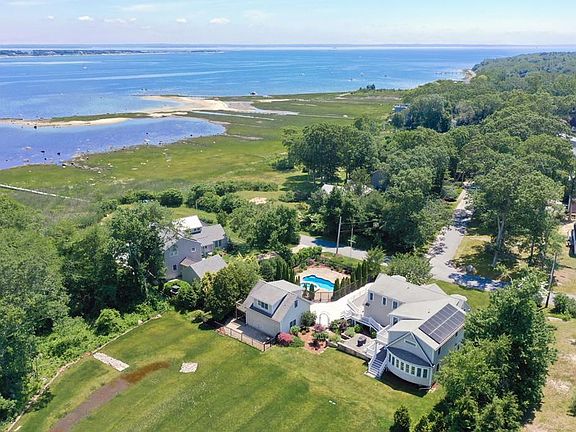 Take in the spectacular water views of Buzzards Bay and beyond from this fully renovated, custom-designed home with access to an association dock! This home offers a wide open floor plan with a gourmet kitchen with large center island, plus living and dining areas, that all spill onto the expansive deck. Also with a formal living room with gas fireplace and wet bar, making this a wonderful home for entertaining. Complete with 5 bedrooms, including large master suite, 3.5 baths, first floor guest suite, plus separate guest quarters located above the garage. The professionally landscaped grounds include an in-ground, heated pool, hot tub, private patio, and detached 2 car garage. Just minutes to village center, Silvershell Beach, and town clubs. This house is not one to miss!