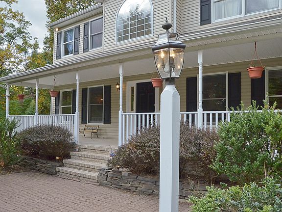 This Magnificent eleven room front porch colonial, set on 5.2 gorgeous acres. Features: Two story entrance, 9' ceilings on first floor, hardwood floors, den, family room with vaulted ceiling and floor to ceiling stone wood burning fire place, large eat in kitchen, finished walk-out lower level with full bathroom, rec room/play and leisure room opening to patio..kitchen eat area opens to patio and pool as well. Master suite with cathedral ceiling, leisure sitting room, two walk in closets, master bath with cathedral ceiling, skylights, dual sinks and Jacuzzi tub. This home has three car garage, in-ground pool and extensive pavers work as well as stone front area. Home is conveniently situated to NYC rail and bus services, just minutes from all major highways.