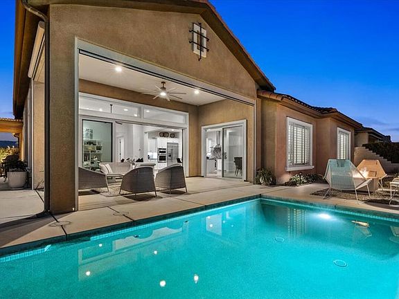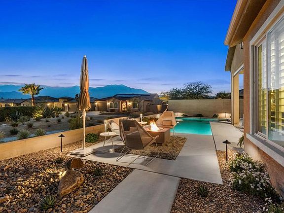 Tuscan SERENITY w/OWNED SOLAR offers 2 Private Suites PLUS 1/2 Bath on an elevated South and West Mountain View Lot. Past the courtyard, you are greeted by a custom glass door and rotunda foyer w/tray ceiling, porcelain tile floors, and custom art lighting setting an elegant tone. Enjoy a private office w/French doors and custom built-ins reaching the ceiling. With no expense spared, every closet, storage system, and built-in has been thoughtfully customized. The Gathering Room features a MULTI PANEL SLIDING DOOR SYSTEM w/motorized window coverings highlighting indoor/outdoor living. The covered patio can also be converted into a screened oasis! The Kitchen features granite counters w/full-height backsplash, CHEF'S PACKAGE including 2 convection ovens PLUS a convection/micro combo, built-in refrigeration and custom pendant lighting. Bonus built-in beverage/wine center w/refrigeration and storage. The owner's suite has a roll-in shower, dual vanities, and custom closet. Outside the pebble pool and side patio w/pergola are ready to accommodate your largest gatherings. Garage includes built-in workshop/storage, water softener plus ENERGY UPGRADE (insulated garage walls/ceilings, upgraded condensing tankless water heater) PLUS its own HVAC system.