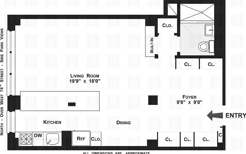 Contract Signed. Huge Open Kitchen Side Park Views Fantastic Value: You will love the custom renovation of this wonderful studio apartment! Located on a high first floor (there are street-level windows below this) the apt directly faces a quiet block of beautiful historic district townhouses on West 74th Street. This is only one apt from Riverside Park and has very pretty side park views. The layout includes: a large Foyer with custom built-ins with numerous closets and unparalleled storage, a large Living Room, an enlarged windowed Kitchen opened to the living room with a terrific expanse of granite/breakfast bar, an interior alcove suitable for dining or desk area, a completely custom bathroom (with gorgeous walk-in shower, new tiles, new floor, new fixtures) plus additional storage. The kitchen is larger than the kitchens of most 2 Bedroom homes and features Kraftmaid cabinets with tremendous storage and drawers, granite counters/backsplash and stainless steel appliances (Fisher & Paykel, GE Monogram and LG). To top it off, the electric has been upgraded and there is through-the-wall air conditioning. This home is great for those who enjoy cooking and entertaining. Schwab House is a fully serviced cooperative building in the heart of one of the most highly desirable, vibrant, beautiful and historic residential neighborhoods in Manhattan. Located around the corner from Fairway, Citarella, Trader Joe's, The Beacon Theater and the #1, 2 & 3 subways, it is also across the street from Riverside Park with its playgrounds, bicycle paths, sports fields, dog runs and marina. Enjoy nights in the neighborhood, for in addition to restaurants galore, it is a very short distance to Lincoln Center for the Performing Arts and multiple cinemas. Enjoy the easy living here which includes on-site management and 24 hour: doormen, concierge, elevator operators, handymen and garage, plus a gym, playroom, two luxuriously landscaped roof decks with fantastic views, bike room, dry cleaner, lending library & a renovated, air conditioned modern lobby. Pied-a-terre friendly, accessible and pets are permitted. Open houses are not permitted; however, this terrific home is easily shown by appointment.