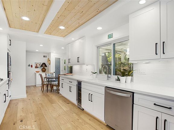 Delightful condo with serene views of greenery and trees. Well-sought after corner location offers tranquil sunset views from three secluded patios. This soft contemporary home features an open floor plan with volume ceilings and an abundance of light. Wonderful wall spaces offer fantastic opportunities to display and highlight your favorite art pieces. The recently remodeled kitchen features white shaker cabinets, quartz countertops, wine refrigerator and spacious pantry. The breakfast nook with cozy window seat invites you to enjoy your morning coffee while listening to the birds chirping on the garden patio. The home features white oak wood flooring throughout.