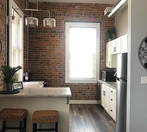 Second floor apartment in a newly renovated historic building in downtown Farmington, Missouri. This apartment has high ceilings, exposed brick walls and all new stainless steel appliances. This apartment is located at 11 S. Jackson St. (upstairs above #30 E. Columbia Street) and is the perfect place for someone who prefers not to live in a large apartment complex. The brick on all the exterior walls has been exposed. The ceilings are 12 ft. high. The bathroom is tile with all new fixtures. The kitchen has new stainless steel appliances including a dishwasher. There is a washer/dryer in this unit as well as a small office. The building includes a monitored fire alarm system. This building is located within walking distance of several restaurants, bars and coffee shops as well as the post office and numerous banks and churches. The convenience and character of this building is unique to the area. This apartment is a one bedroom and can accommodate up to 2 people. No pets or smoking allowed. This apartment is fully furnished and monthly rent includes all utilities. Please call or email for more information. The minimum lease term is 3 months. This apartment is on the second floor of a recently renovated historic building in downtown Farmington, MO. There is a limit a 2 people in this one bedroom apartment. No pets or smoking allowed. We don't require tenants to obtain renters insurance, but we always encourage getting it. Parking is street parking on the side of the building near the entrance to the second floor staircase. The building is always locked and only accessible to tenants. We often lease this fully furnished property to traveling nurses.