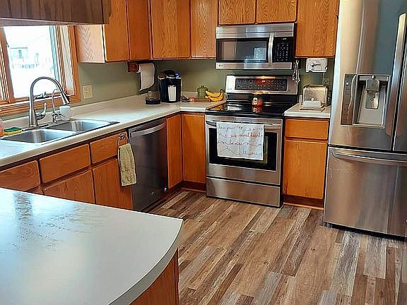 White rambler with black shutters and black roof built in 1991, plus detached work shop heated 22 X24 and utility shed 10x 16 with lofts on both sides. Lot is a double lot 100 x 140. It's a spacious 3 bedroom and 3 bathroom with main floor laundry. The master bedroom has a large walk in closet with attached full bathroom included in Master bedroom space. Main square feet 1120 and basement fully finished 1120. The basement is a poured cement basement.