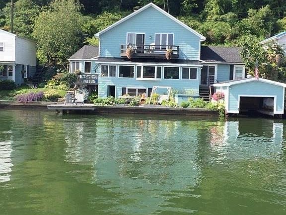 Something Old, Something New, Something Borrowed, Something Beautiful. The remodel of this once seasonal cottage incorporated all the luxuries and amenities that you look for in your home, while retaining all the charm of the original cottage. Nearly every room has panoramic views of the lake through large banks of windows. Kitchen features a central island that houses a dishwasher and sink with plenty of storage beneath and seating around. You will almost enjoy doing the dishes as you gaze upon the lake. The large sunroom offers plenty of room for dining and entertaining with the lake as a backdrop. Two bedrooms, completely tiled, full common bath, spacious LR with large built-in shelving and laundry completes the first floor. Retire to the second floor primary suite. No shortage of storage here with four large closets and add'l storage in the primary bath. Primary bath is drenched with natural lighting from the lge skylight, soak in the garden tub or relax on your private balcony w/ elevated views of the lake. An add'l large skylight over the bed will have you seeing stars! Kids will love the bath/bunk house, and you the garage & boathouse. Lge, dock, deck and beautiful gardens.